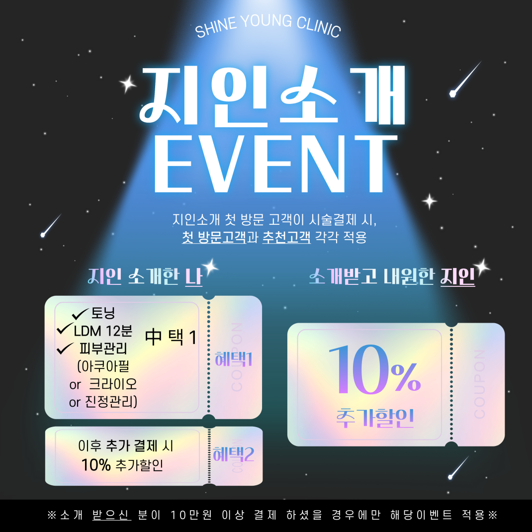 지인소개 이벤트 작성자관리자 등록일 25-12-01 조회198회 이미지 준비중입니다. 본문 지인소개 이벤트 세종대 건국대 학생 및 임직원 이벤트 샤인영의원 크리스마스 EVENT 목록
